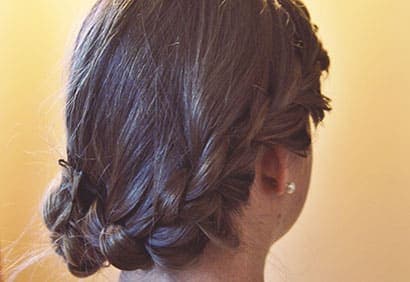 3. Avec cette mèche, on entame une tresse française qui débute près d’une oreille, se poursuit autour de la tête, passe derrière l’autre oreille, et se termine dans la nuque.
